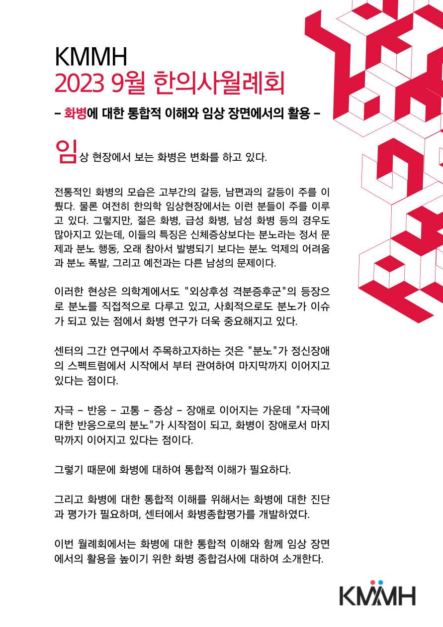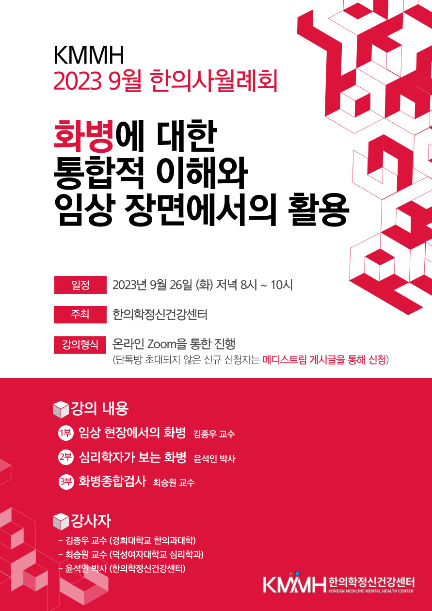 [2023년 9월] 2023년도 9월 한의학정신건강센터 월례회 | “화병에 대한 통합적 이해와 임상 장면에서의 활용”
