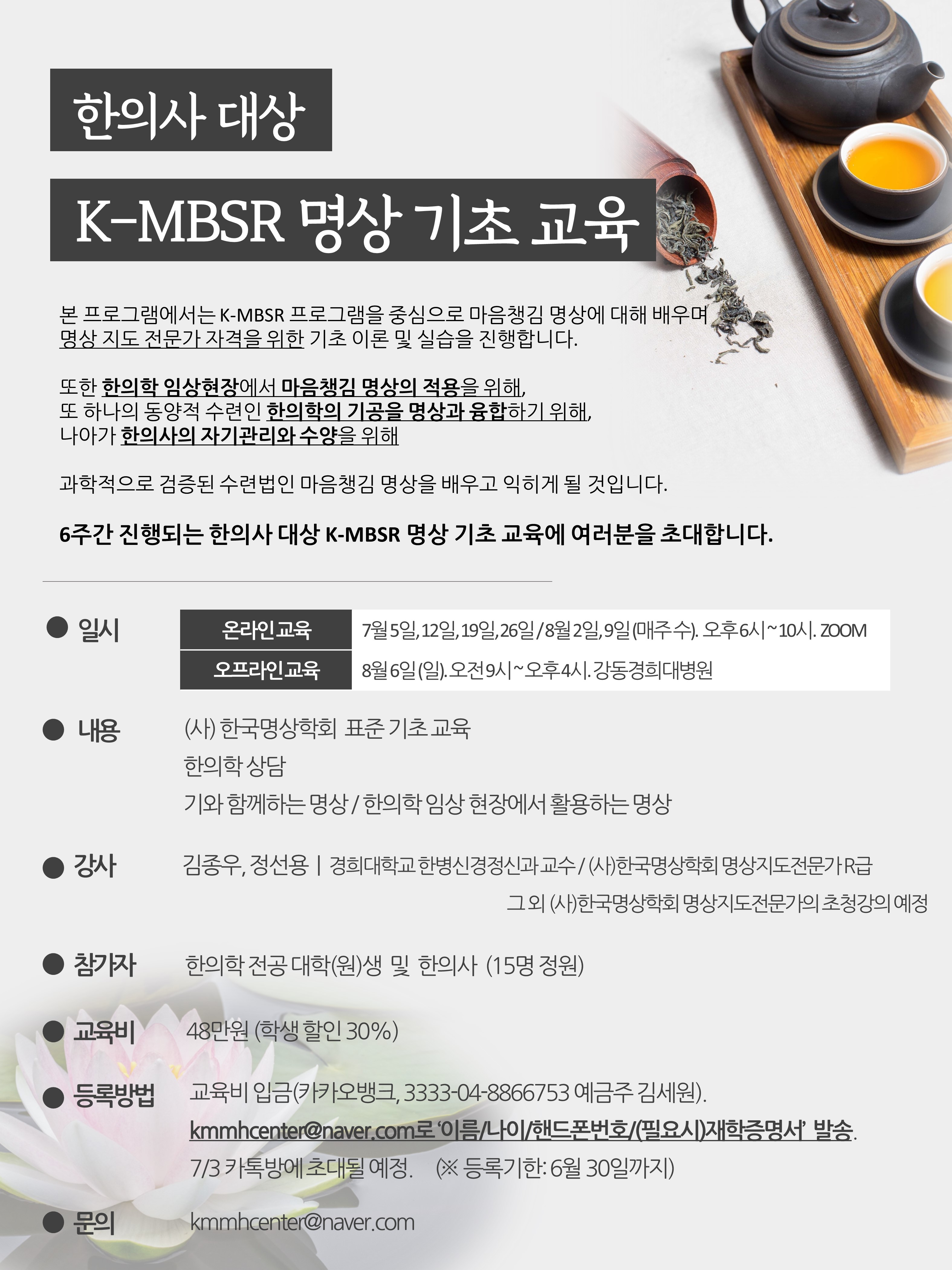 (사) 한국명상학회의 명상 기초 교육을 한의사 대상으로 진행합니다. 본 과정은 명상지도전문가 자격증을 위한 과정입니다. 해당 교육을 이수 한 이후 명상을 임상에서 활용하고, 이후 소정의 시험과 평가 이후 자격증을 취득하게 됩니다. 본 과정은 6주, 24시간의 표준 프로그램을 기준으로 하고, 한의학 임상 현장에서의 활용을 고려하여 진행...