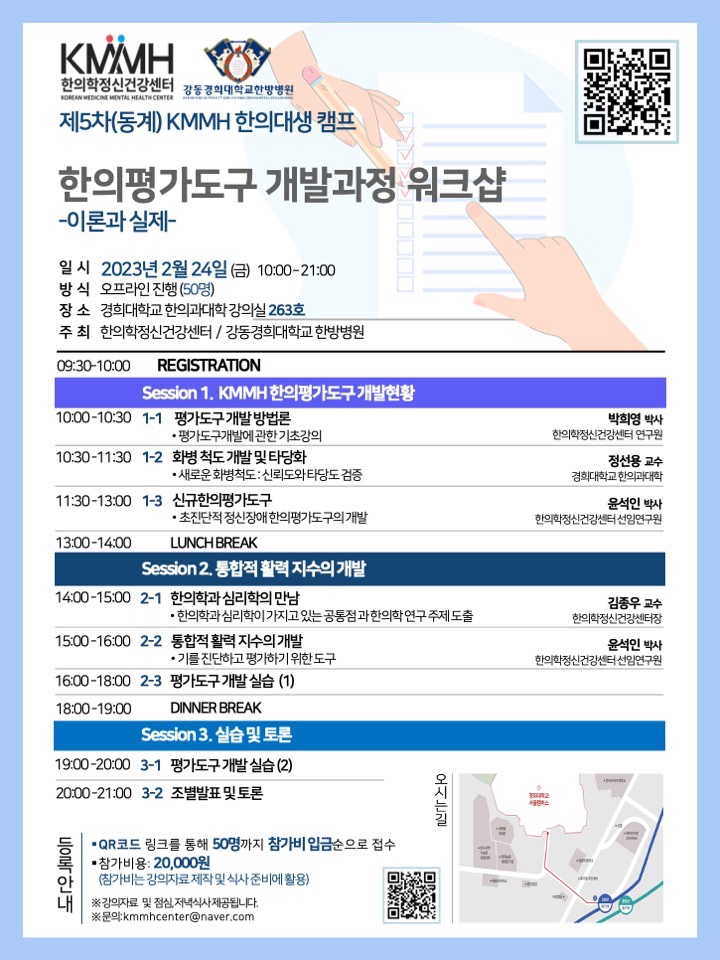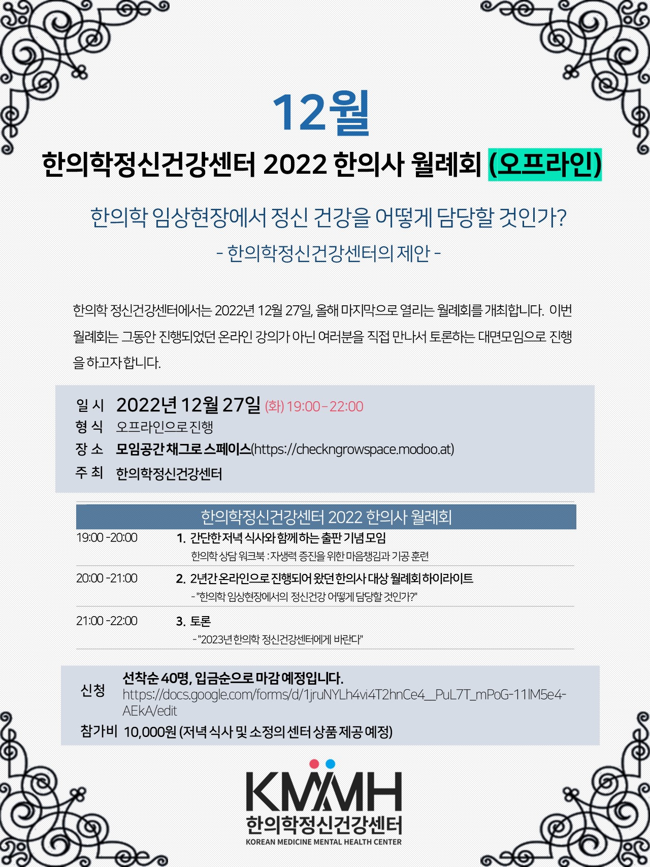 [2022년 12월] 2022년도 한의학정신건강센터 월례회 9차. (오프라인)한의학 임상현장에서 정신 건강을 어떻게 담당할 것인가? - 한의학 정신건강센터의 제안 - 한의학 정신건강센터에서는 2022년 12월 27일, 올해 마지막으로 열리는 월례회를 개최합니다. 이번 월례회는 그동안 진행되었던 온라인 강의가 아닌 여러분을 직접 만나서 토론하는 대...